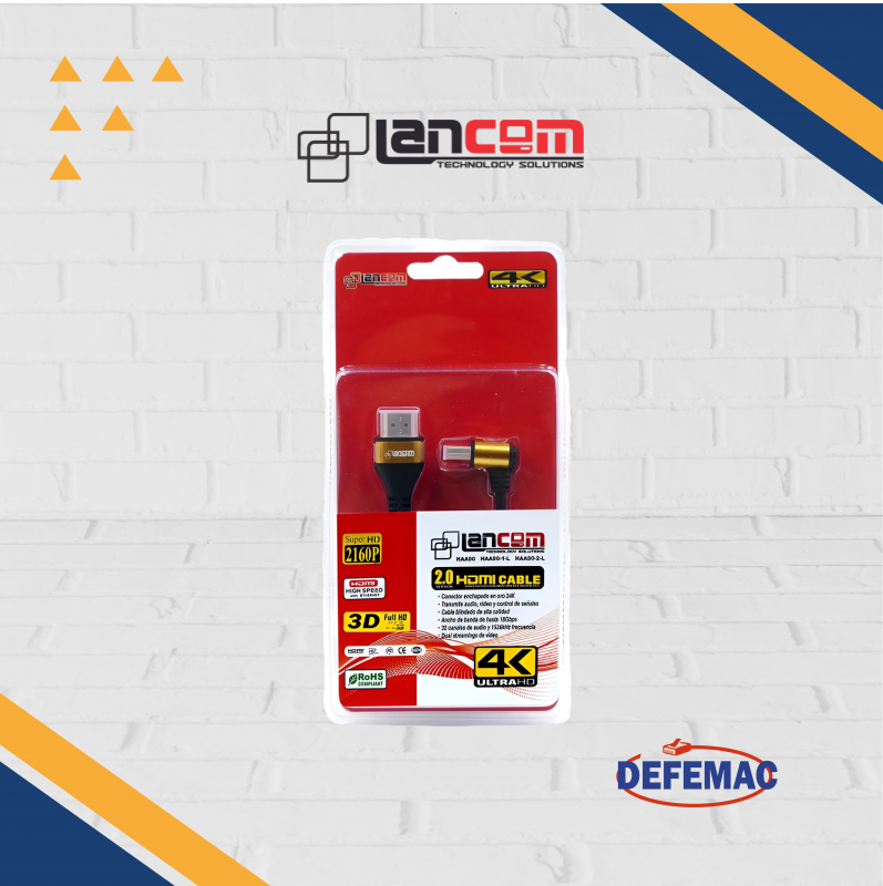 El cable HDMI 2.0 Slim en codo de 2 metros LANCOM modelo ZZ-HAA90-1L2 está diseñado para instalaciones ajustadas sin comprometer la calidad. Ofrece transmisión de audio, video y control de señales en resolución 4K Ultra HD con un diseño compacto y conectores enchapados en oro 24K.