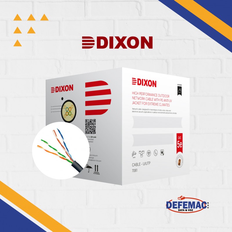 Diseñado para exteriores, el cable UTP Dixon Cat 5e modelo 7061 ofrece un rendimiento confiable y protección contra los rayos UV gracias a su chaqueta PE con tratamiento Anti-UV. Ideal para entornos exigentes de red.
