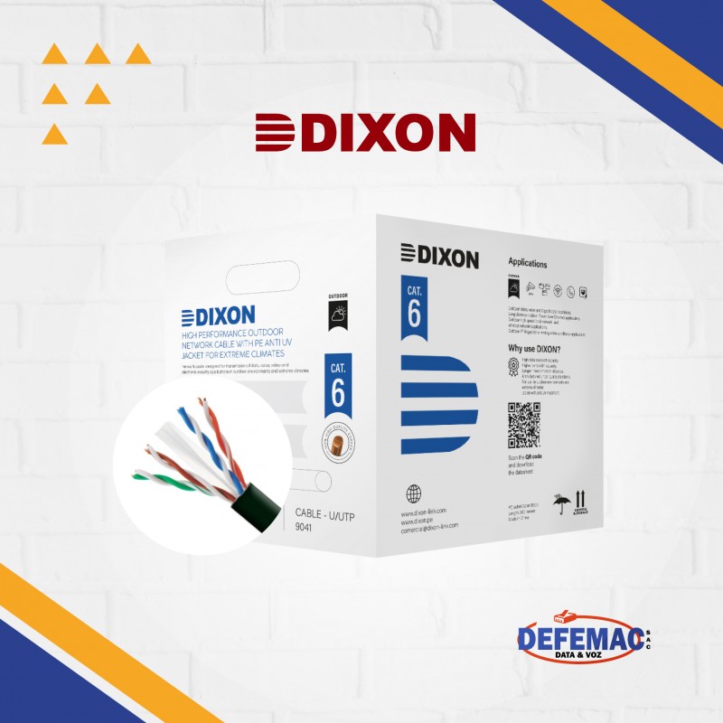 Cable UTP Categoría 6 de Dixon, modelo 9041, diseñado para uso en exteriores. Ofrece resistencia a rayos UV, alto rendimiento y cumple estándares de redes TIA/EIA.