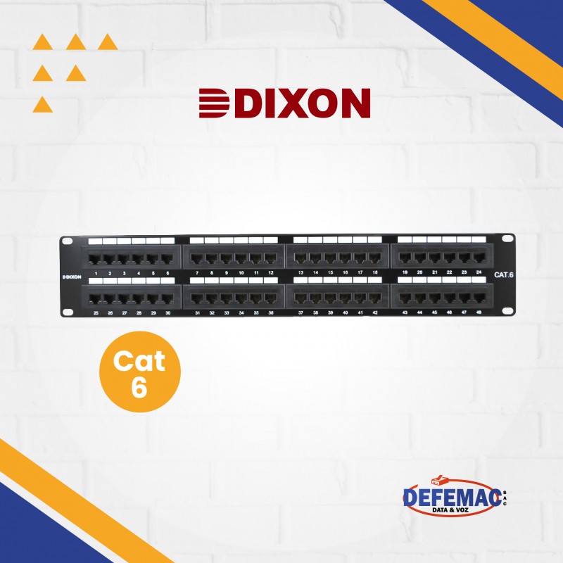 Patch panel categoría 6 de la marca DIXON, modelo P48T-K11-C6C/BK. Panel UTP cargado con configuración de 180°, ideal para instalaciones en centros de datos. Cumple con normas TIA/EIA 568C.2, ISO/IEC 11801 y listado UL.