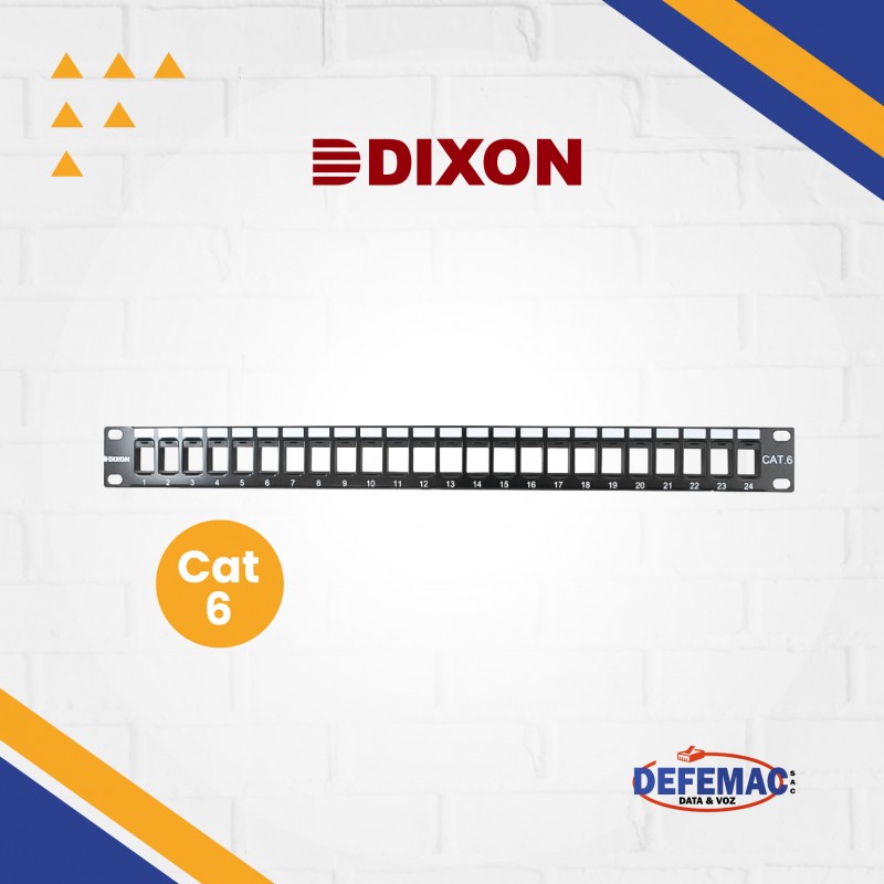 Patch panel vacío de 24 puertos categoría 6 de la marca DIXON, modelo PKJ24-C6-A/BK. Diseñado para soluciones de voz, datos, video, audio y fibra en centros de datos. Compatible con conectores Keystone UTP y serie MU5.