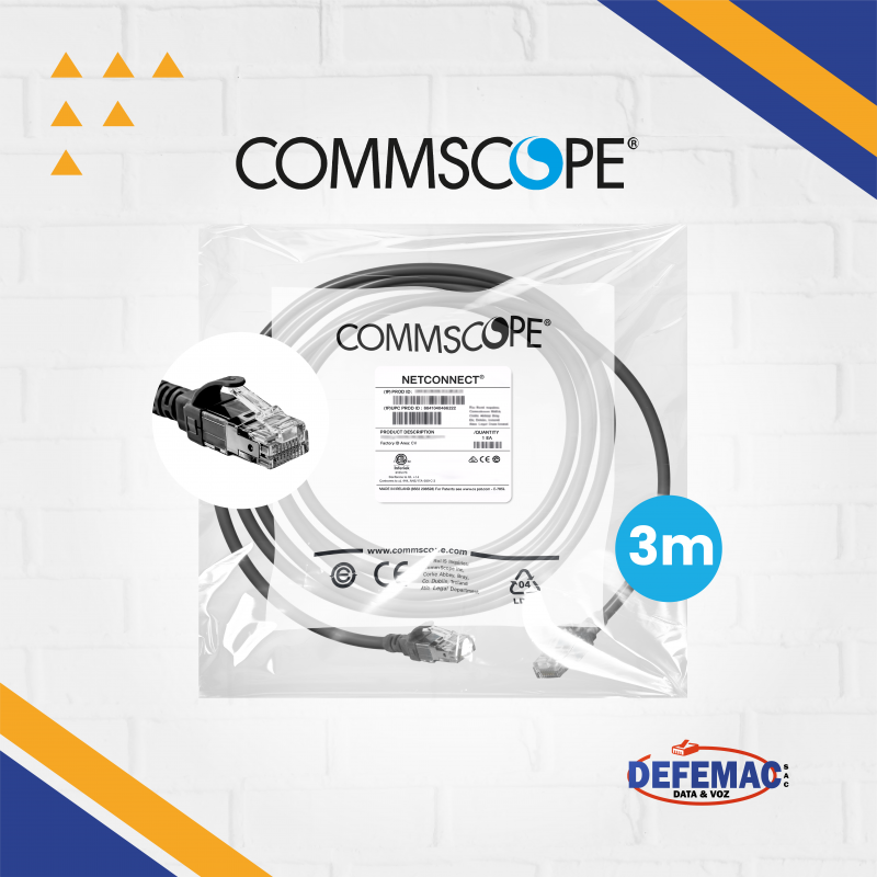 El Patch Cord COMMSCOPE Cat 6A S/FTP de 3 metros en color negro brinda alto rendimiento y excelente blindaje para conexiones críticas en redes empresariales y de telecomunicaciones.